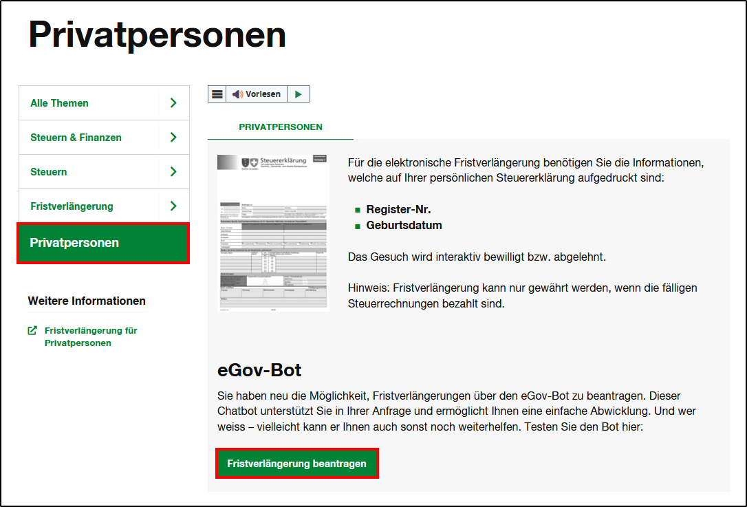 - Klicken Sie hier im Beispiel von Privatpersonen auf <Fristverlängerung beantragen> und erfassen Sie im Fristverlängerungsassistenten Ihre Angaben.