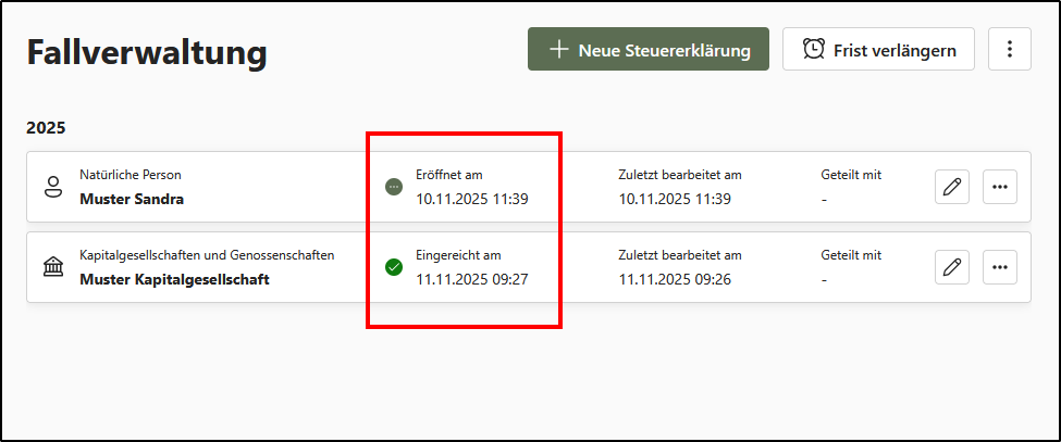 Jede Steuererklärung ist mit einem Bearbeitungsstatus versehen, der jeweils durch ein Datum ergänzt wird: