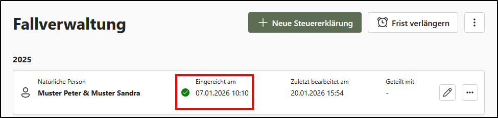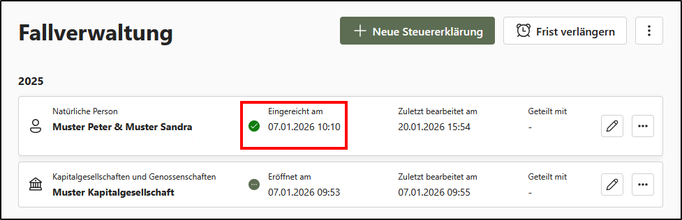 In der Fallverwaltung erhalten Sie eine umfassende Übersicht über Ihre Steuererklärungen. Jede Steuererklärung ist mit einem Bearbeitungsstatus versehen, der jeweils durch ein Datum ergänzt wird: