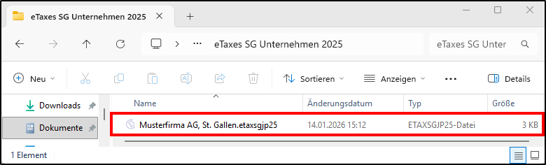 Öffnen Sie das Steuerprogramm eTaxes 2025 aus dem Vorjahr und überprüfen Sie, ob Ihre Steuerdaten aus dem Jahr 2025 vollständig vorhanden sind. Ihre Steuerdatei für natürliche Personen finden Sie standardmässig unter C:\Users <Benuztername>\Dokumente\eTaxes SG Unternehmen\eTaxes SG Unternehmen 2025 und endet auf .etaxsgjp2025.