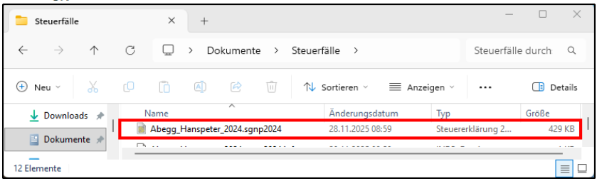 Navigieren Sie zum Speicherort Ihrer Steuerdatei und wählen Sie die entsprechende Steuererklärung mit der Endung .sgnp2024 oder .etaxsgjp25 aus. Wählen Sie anschliessend <Öffnen>.