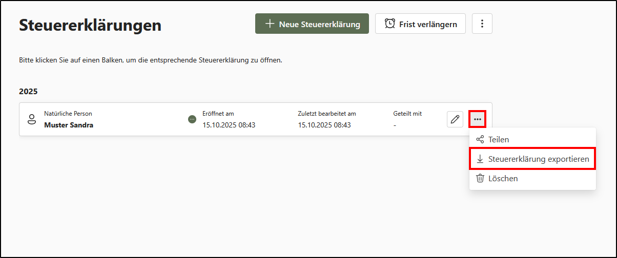 - Klicken Sie bei der entsprechenden Steuererklärung rechts auf die drei Punkte und wählen Sie <Steuererklärung exportieren> aus.