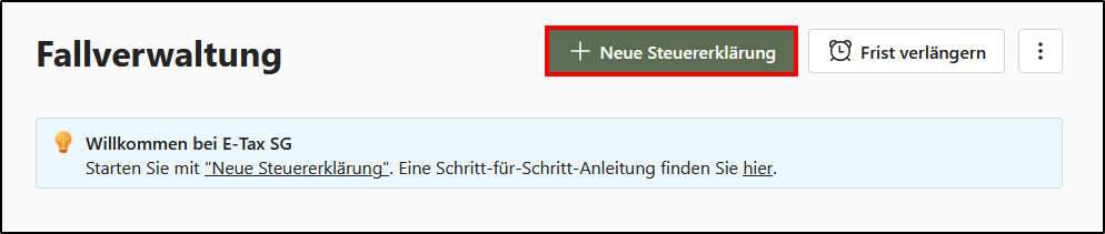 - Klicken Sie in der Fallverwaltung auf <+ Neue Steuererklärung>.