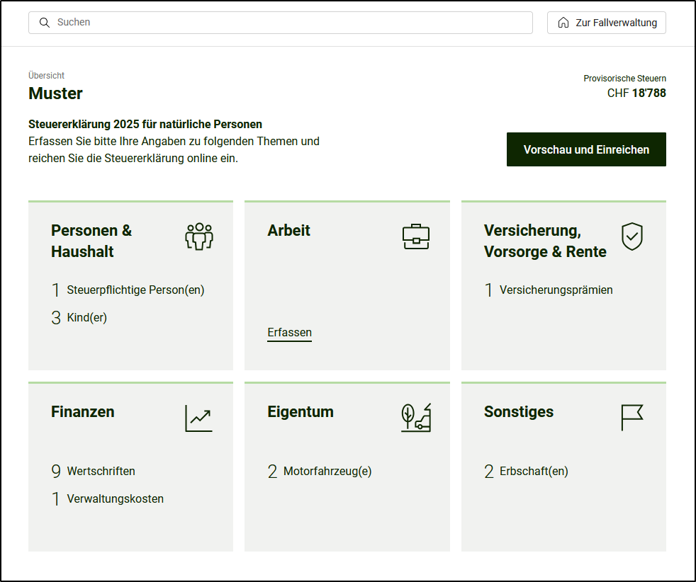 - Die Steuererklärung für 2025 ist nun mit den Vorjahresdaten eröffnet. Sie befinden sich auf der <Übersicht>. Sie können nun mit dem Ausfüllen der Steuererklärung beginnen.