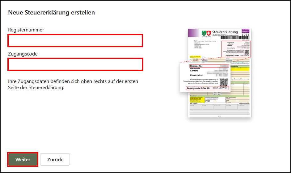 Hinweis: Die Zugangsdaten (PID-Nummer & Zugangscode) finden Sie auf dem Steuererklärungsformular, das Ihnen von der Steuerbehörde St. Gallen per Post zugestellt wurde.
