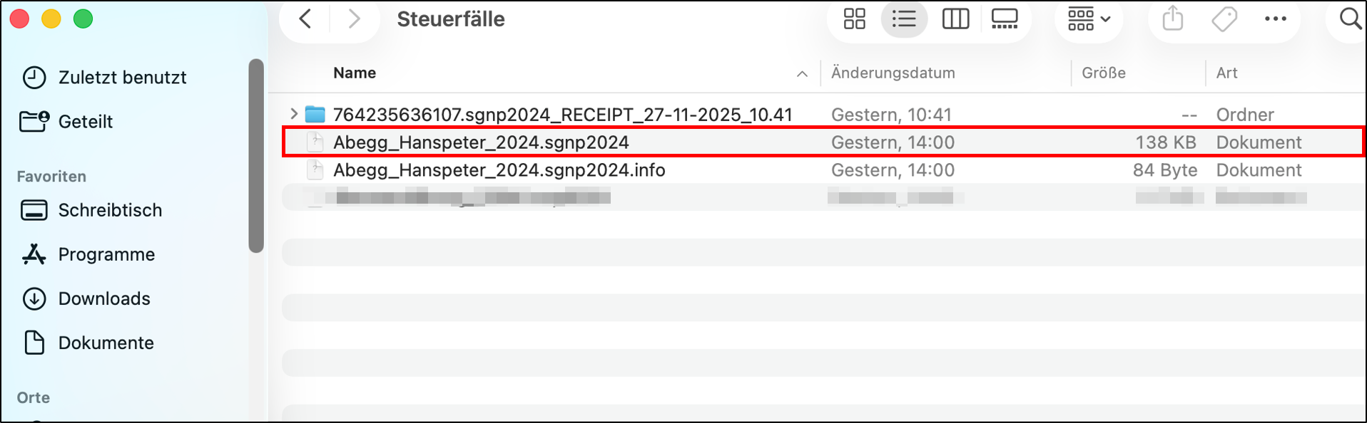 Öffnen Sie das Steuerprogramm "Steuern St.Gallen 2024" aus dem Vorjahr und überprüfen Sie, ob Ihre Steuerdaten aus dem Jahr 2024 vollständig vorhanden sind. Ihre Steuerdatei für natürliche Personen finden Sie standardmässig unter Users/<Benutzername>/Dokumente/Steuerfälle und endet auf .sgnp2024.
