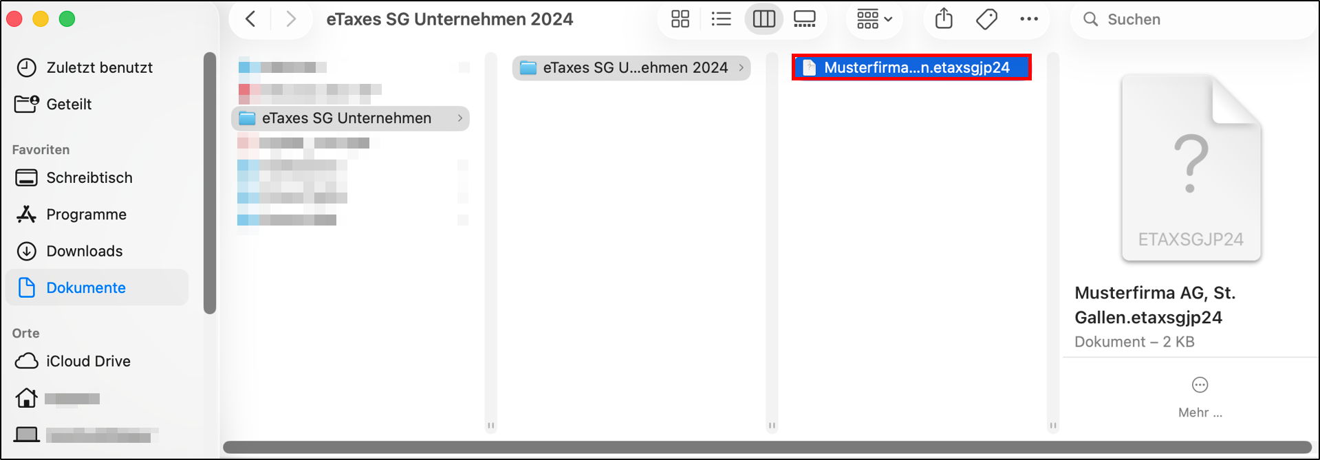 Öffnen Sie das Steuerprogramm "eTaxes Unternehmen St.Gallen 2024" aus dem Vorjahr und überprüfen Sie, ob Ihre Steuerdaten aus dem Jahr 2024 vollständig vorhanden sind. Ihre Steuerdatei für natürliche Personen finden Sie standardmässig unter Users/<Benuztername>/Dokumente/eTaxes SG Unternehmen/eTaxes SG Unternehmen 2024 und endet auf .etaxsgjp2024.