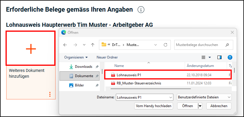 Variante 1: Klicken Sie auf das <+>-Symbol. Daraufhin öffnet sich der Explorer, in dem Sie den gewünschten Beleg auswählen können.