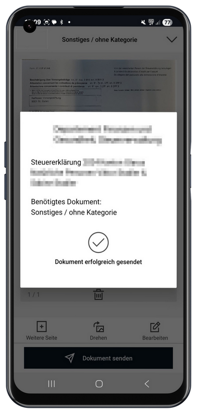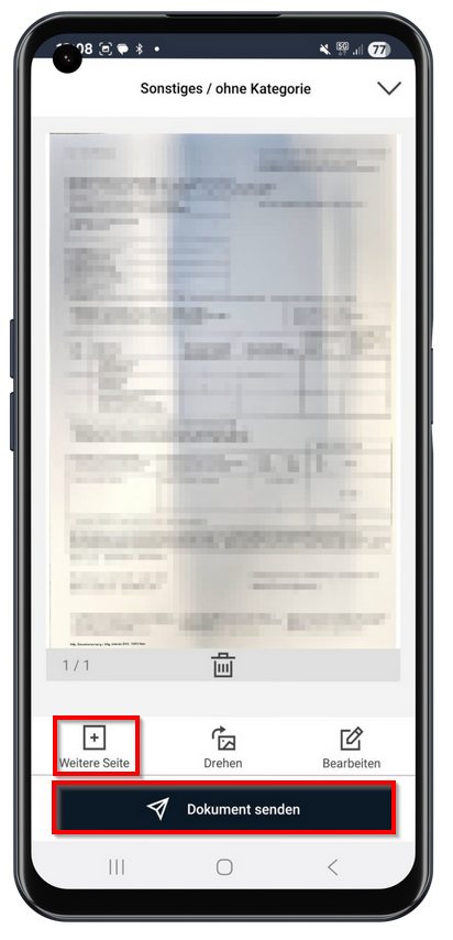 - Tippen Sie auf <Dokument senden>, um das Dokument zu übermitteln. Falls das Dokument mehrere Seiten enthält, können Sie über <Weitere Seite> zusätzliche Seiten hinzufügen.