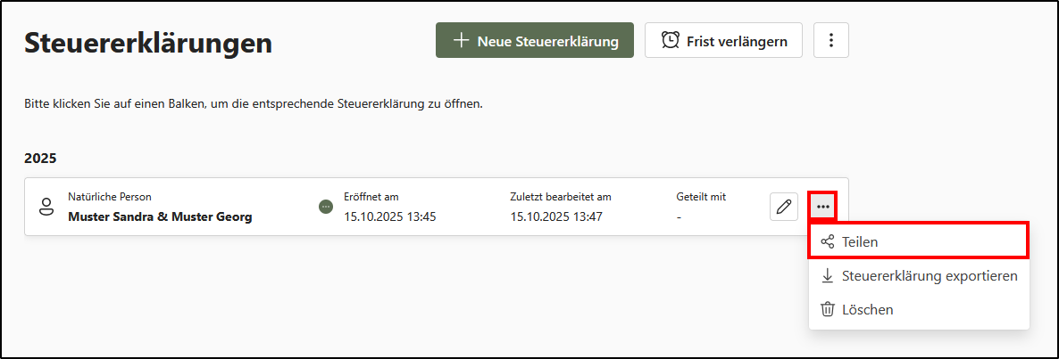 - Die Steuererklärung wurde erfolgreich geteilt und ist nun bei Ihnen im Benutzerkonto ersichtlich.