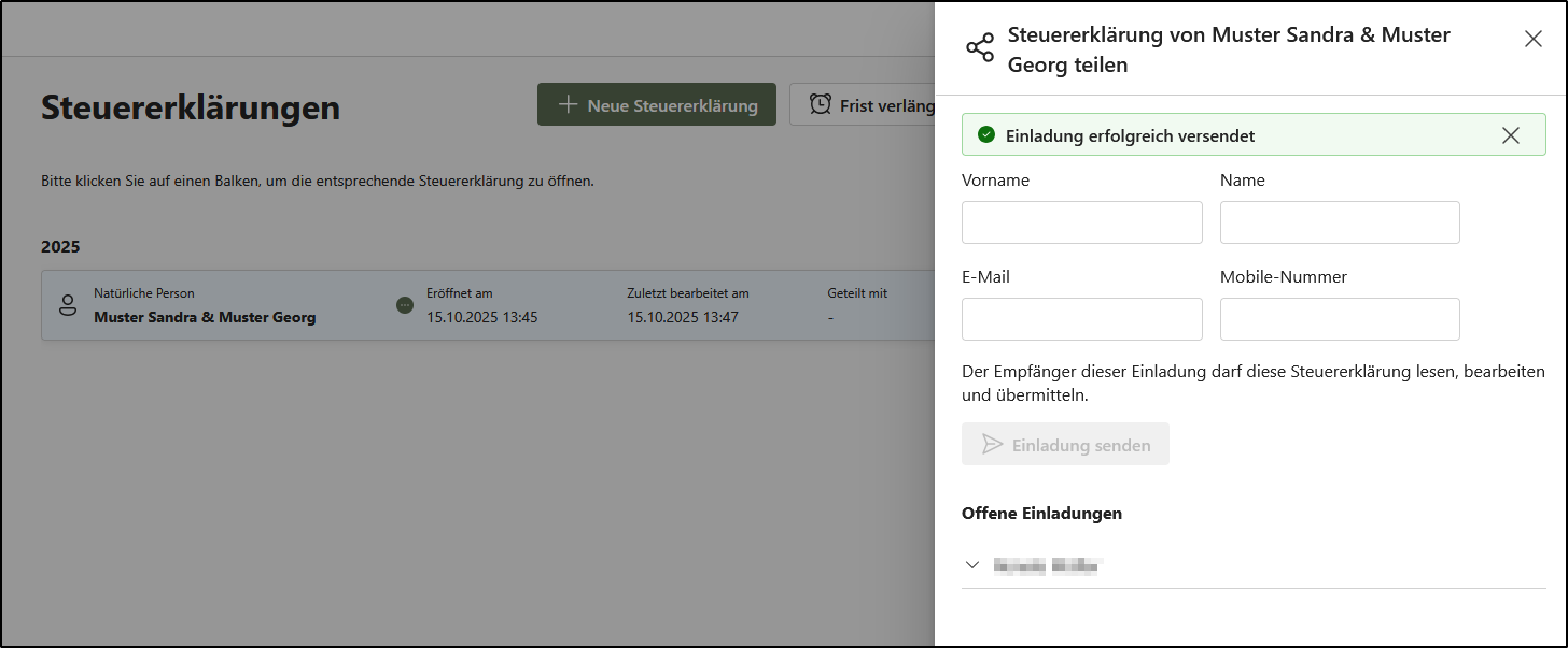 - Sie haben erfolgreich eine Einladung für das Teilen der Steuererklärung gesendet.
