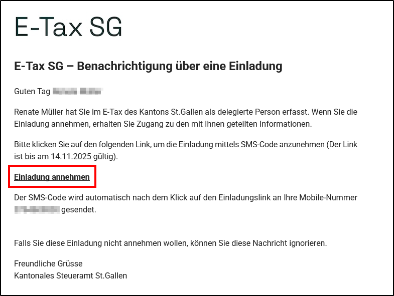 - Sie haben eine Mail vom kantonalen Steueramt St. Gallen erhalten. Öffnen Sie das Mail in Ihrem Posteingang und klicken Sie auf den Einladungs-Link <Einladung annehmen>.