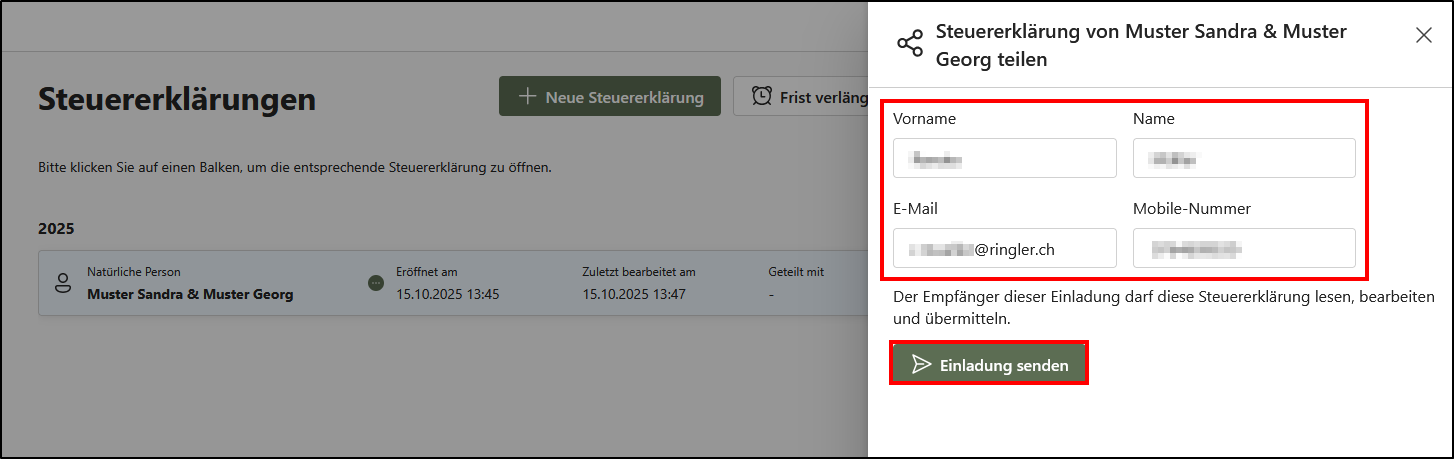 - Auf der rechten Seite wird ein Eingabefeld eingeblendet. Erfassen Sie dort die Angaben der Person, mit der Sie die Steuererklärung teilen möchten.