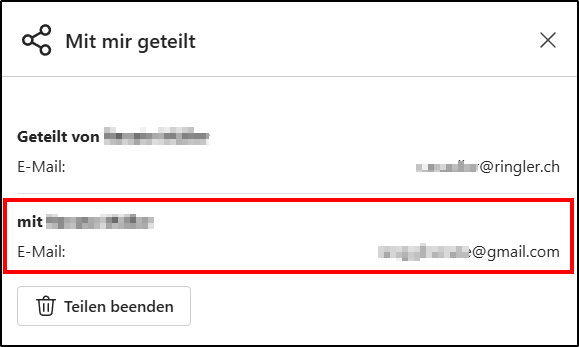 - In dieser Ansicht sehen Sie, mit wem Ihre Steuererklärung aktuell geteilt ist. Die Kontaktdaten der Empfängerin oder des Empfängers werden dabei angezeigt.