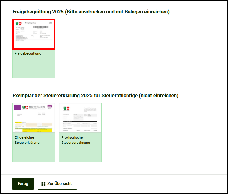 - Sie werden daraufhin direkt zur eingereichten oder erstellten Steuererklärung weitergeleitet und können diese dort einsehen oder als PDF ausdrucken.