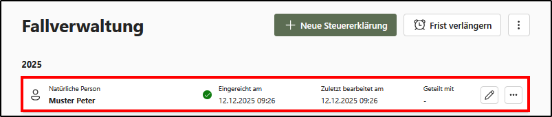 - Wählen Sie in der "Fallverwaltung" die entsprechende Steuererklärung aus.