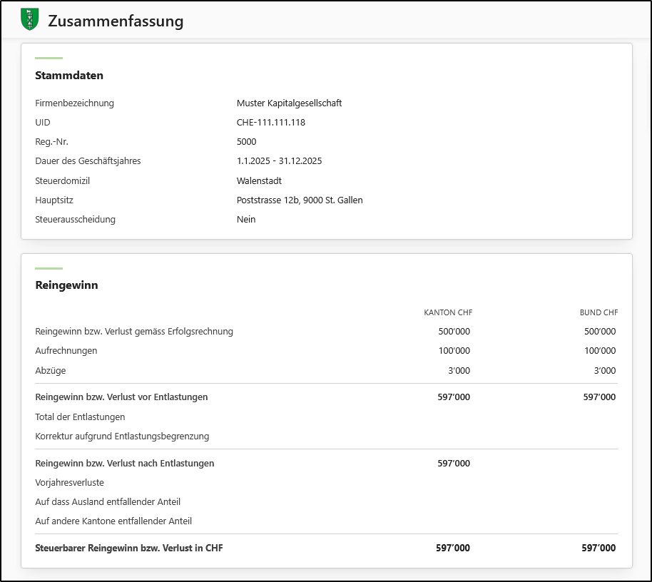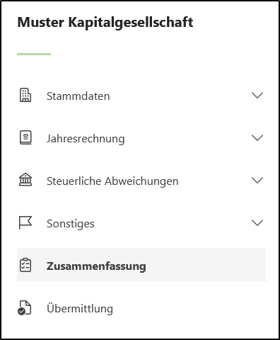 - Wenn Sie sich einen Überblick über die bereits erfassten Daten verschaffen oder die Steuererklärungsformulare in der Vorschau ansehen möchten, können Sie dies über den Menüpunkt <Zusammenfassung> auf der linken Seite tun.