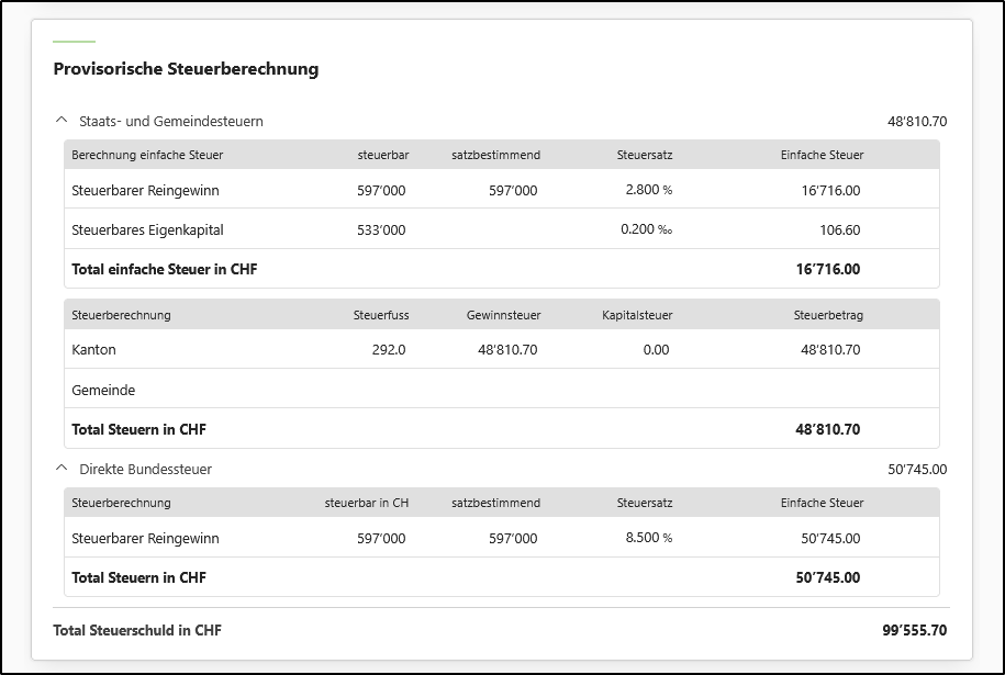 - Am Ende der Seite befindet sich die Karte <Provisorische Steuerberechnung>, mit der Sie die Zusammensetzung der berechneten Steuern im Detail einsehen können. Die Details lassen sich durch Klicken auf die Titel <Staats- und Gemeindesteuern> bzw. <Direkte Bundessteuer> ein- und ausblenden.