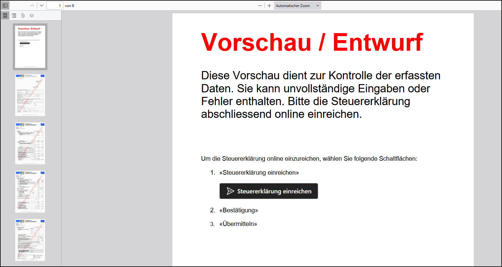 Hinweis: Die Dokumente der Vorschau können nur elektronisch eingereicht werden. Bitte reichen Sie diese Vorschaudokumente nicht bei der Steuerbehörde ein.