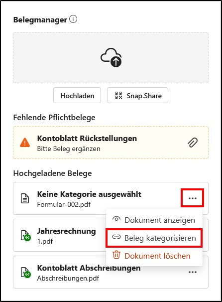 - Sie können nun die hochgeladenen Belege zuordnen, indem Sie über die drei Punkte rechts die Option <Beleg kategorisieren> auswählen.