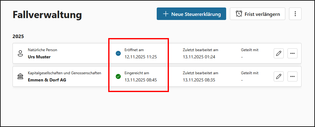 Jede Steuererklärung ist mit einem Bearbeitungsstatus versehen, der jeweils durch ein Datum ergänzt wird: