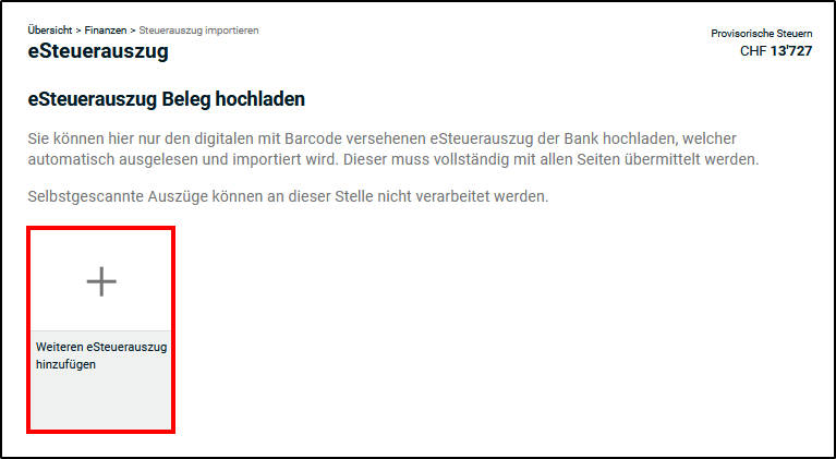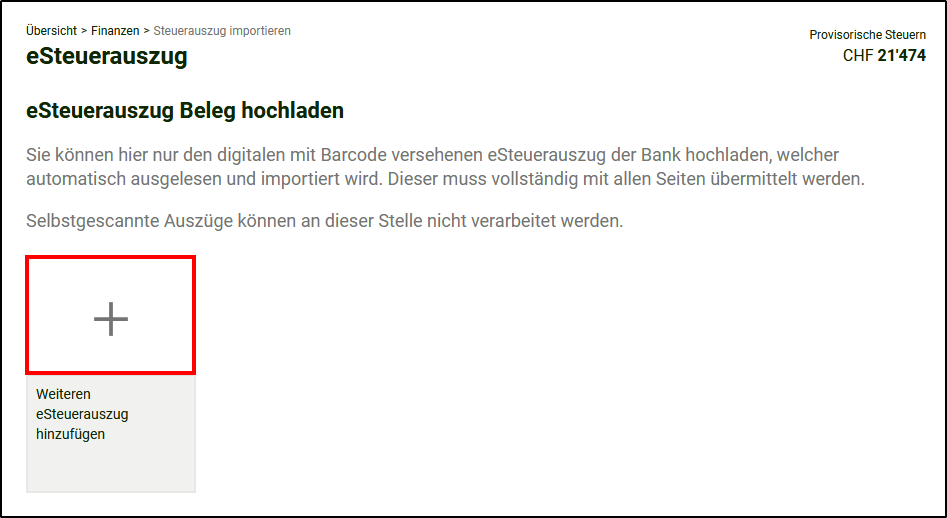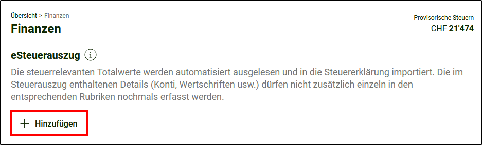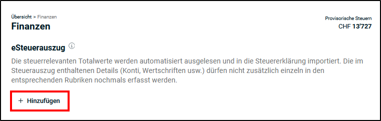 - Um den eSteuerauszug zu importieren, klicken Sie unter eSteuerauszug auf <+Hinzufügen>.
