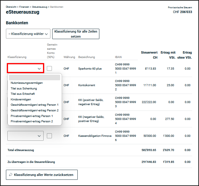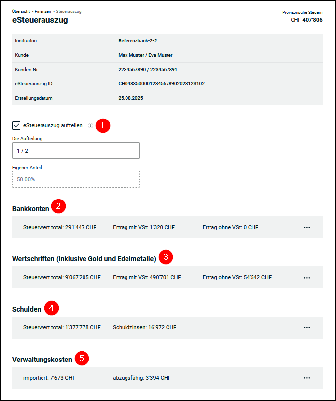 Der eSteuerauszug kann auf der Granularität der Summen anteilsmässig (z.B. 1/2) aufgeteilt werden. -