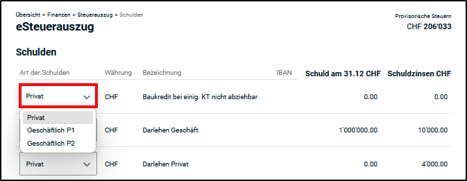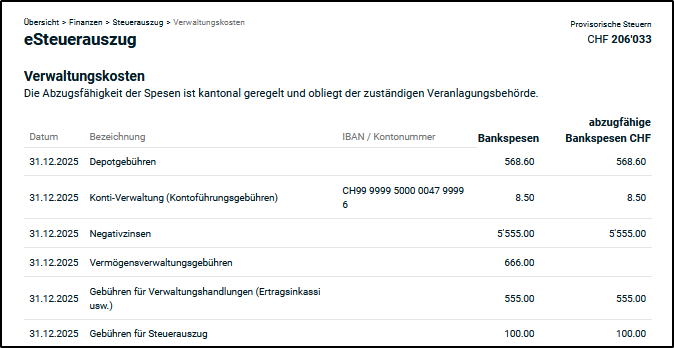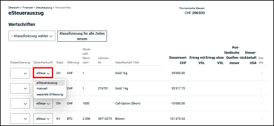 - eSteuerauszug - Dieser Wert ist standardmässig hinterlegt. Das bedeutet, der Eintrag wurde vom eSteuerauszug ausgelesen und eingefügt.